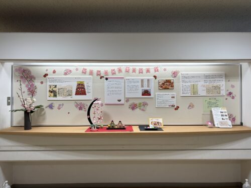 C校舎1階のフリースペースには、豪華な七段の「ひな人形」が飾られています。また、中学昇降口の掲示コーナーでは、女の子の健やかな成長と健康を願って行われてきた伝統行事「ひな祭り」が分かりやすく紹介されています。