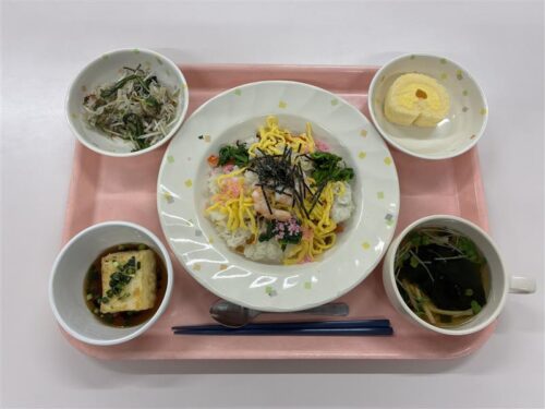 そして、本日のスクールランチの献立は、「おひなさまメニュー(ちらし寿しと揚げ出し豆腐)」です。桃色のデンブ(おぼろ状)と錦糸玉子、菜の花が、彩り豊かにちらし寿しの上に乗っており、春らしさを演出しています。女の子のお祝いの日に相応しい特別献立となりました。